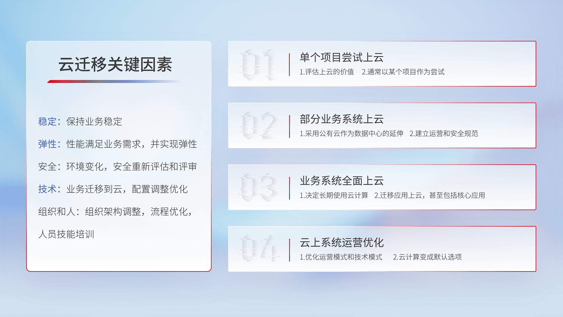 结合实际业务,,,从规划设计、、、、云平台选型、、、云原生改造、、、数据迁移、、集成交付,,,,迁移全过程为客户识别最佳上云路径,,,,做好风险识别管理,,,设计网络架构、、、身份权限、、、、安全审计合规、、操作审计、、、、日志审计、、、监控告警策略、、、多站点容灾设计等,,,对云上基础设施进行整体规划,,提升IT治理水平,,,以满足弹性、、、高可用、、高性能的需求。。