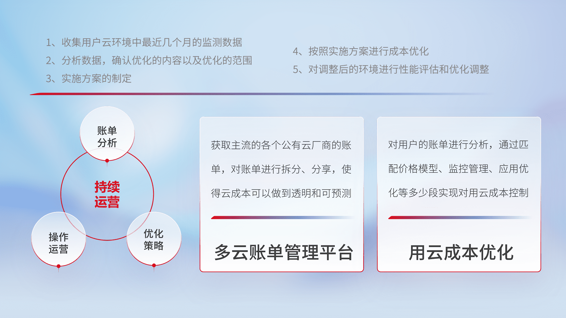 通过多云纳管,,,以统一的资源数据模型把客户的云资源进行抽象和封装,,进而实现对多云资源的统一操作,,,保障云资源管理的可靠性、、、、稳定性与可用性。。。。量身定制化运维内容,,配置、、开发运维、、、补丁管理、、、备份、、、、监控、、、、认证和访问管理、、审计和日常巡检等,,,,保障在用云过程中的可靠度,,稳定度以及高可用率。。